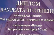 26 февраля состоялся гала-концерт республиканского конкурса "Мы мужество славим в веках" в КЦ им.Пушкина, наша участница Соколова Алиса с педагогом Дубровой Региной Хасановной была удостоена Диплома лаурета 3 степени конкурса чтецов с произведением Берггольц "Первое письмо на Каму". Поздравляем
