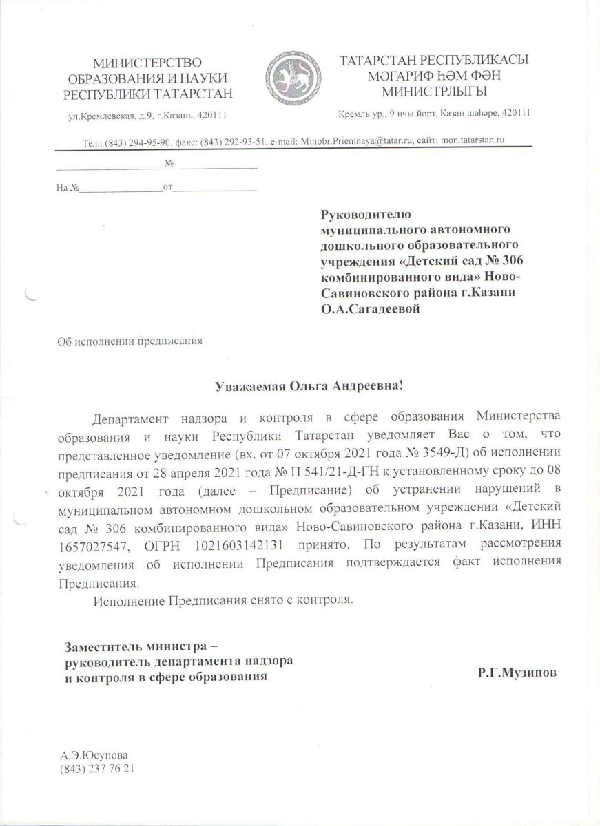 Предписание Департамента надзора и контроля в сфере образования от 28.04.2021 года