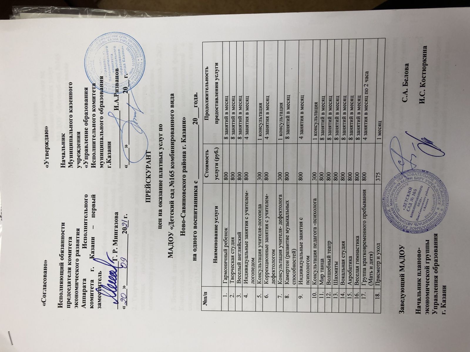 Утверждение стоимости обучения по каждой образовательной программе (прейскурант цен)