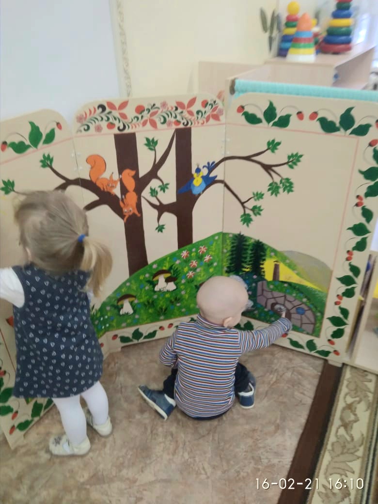 Ребята из группы раннего возраста с удовольствием рассматривают ширму, которую расписала семья Суспициных. На ней вырос лес с лесными жителями. Малыши знакомятся с обитателями леса. Все детки любят животных. Если с домашними питомцами мы более-менее встречаемся часто, и имеем возможность с ними поиграть, то с дикими животными все намного сложнее.