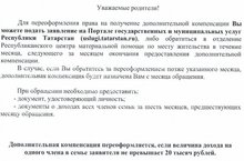Уважаемые родители! Для переоформления права на получение дополнительной компенсации Вы можете подать заявление на Портале государственных и муниципальных услуг Республики Татарстан (uslugi.tatar.ru) ,либо обратиться в отделение Республиканского центра материальной помощи по месту жительства в течение месяца,следующего за месяцем окончания предоставления дополнительной коменсации.