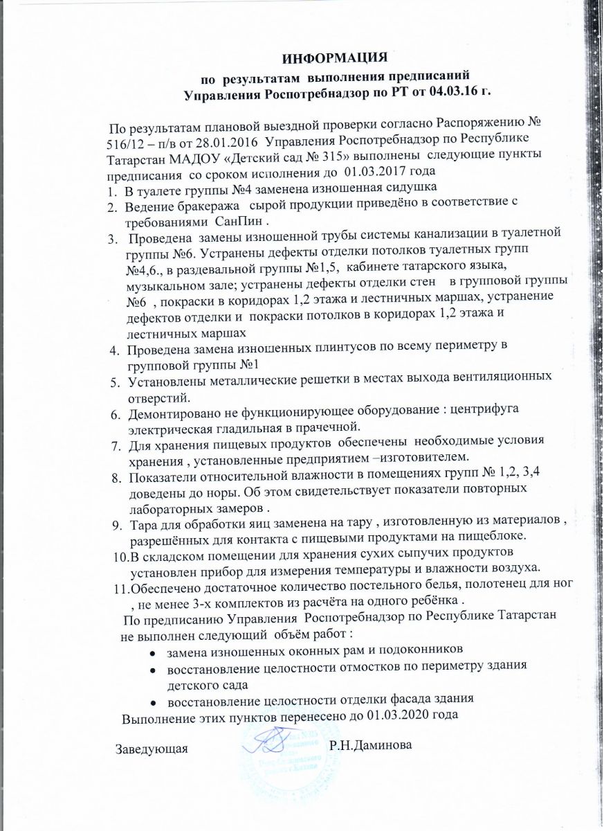 Отчёт о выполнении предписания управления Роспотребнадзор от 02.12 2019