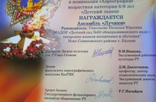 "Пятый открытый республиканский фестиваль конкурс детских, юношеских, молодежных творческих коллективов и исполнителей - 2019". Дипломанты 1 степени в номинации "Хореография", возрастная категория 6-9 лет "Детский танец" (под руководством инструктора Савельевой Н.Ю.).