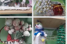 На выставке представлены поделки воспитанников всех групп детского сада, изготовленные совместно с родителями и воспитателями. Мягкие игрушки, открытки, елочные игрушки, композиции из природных материалов, снеговики, снежинки и елочки украшают группы и холл детского сада.
