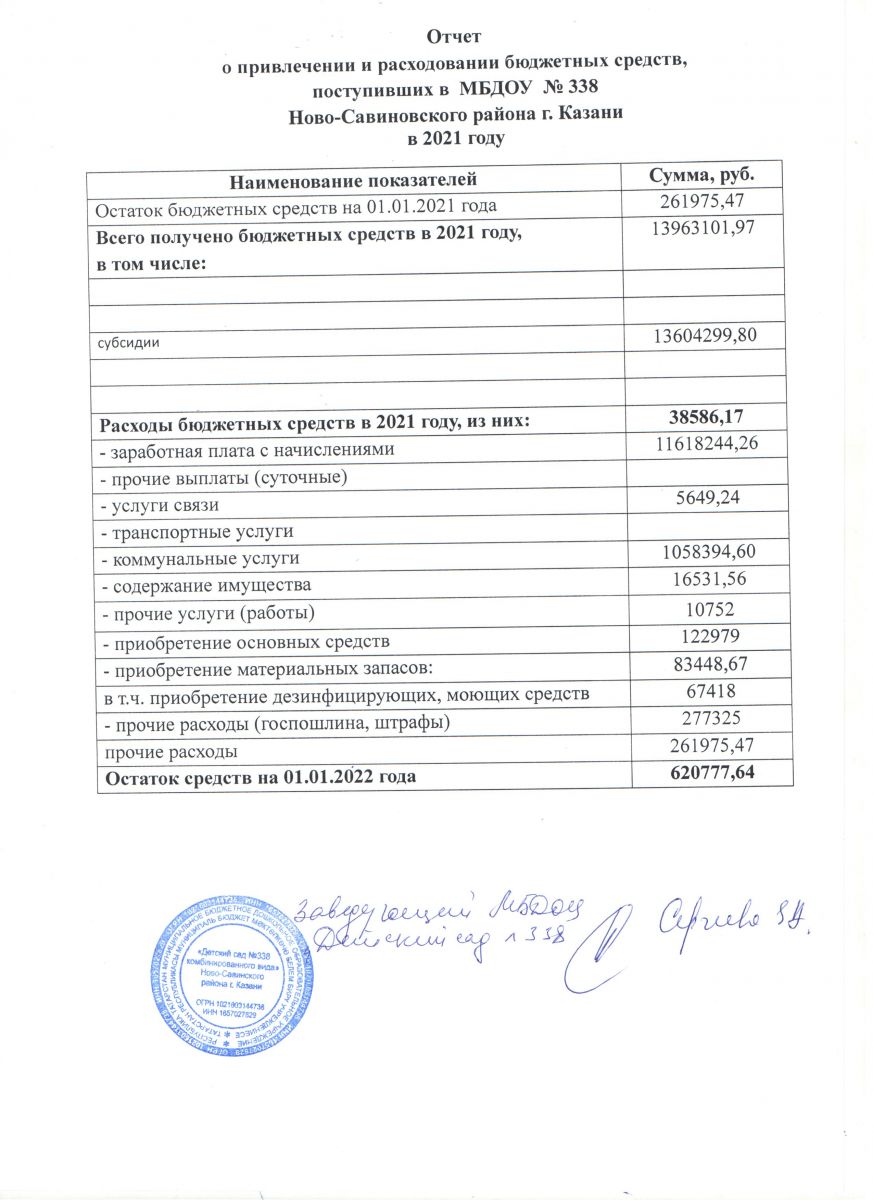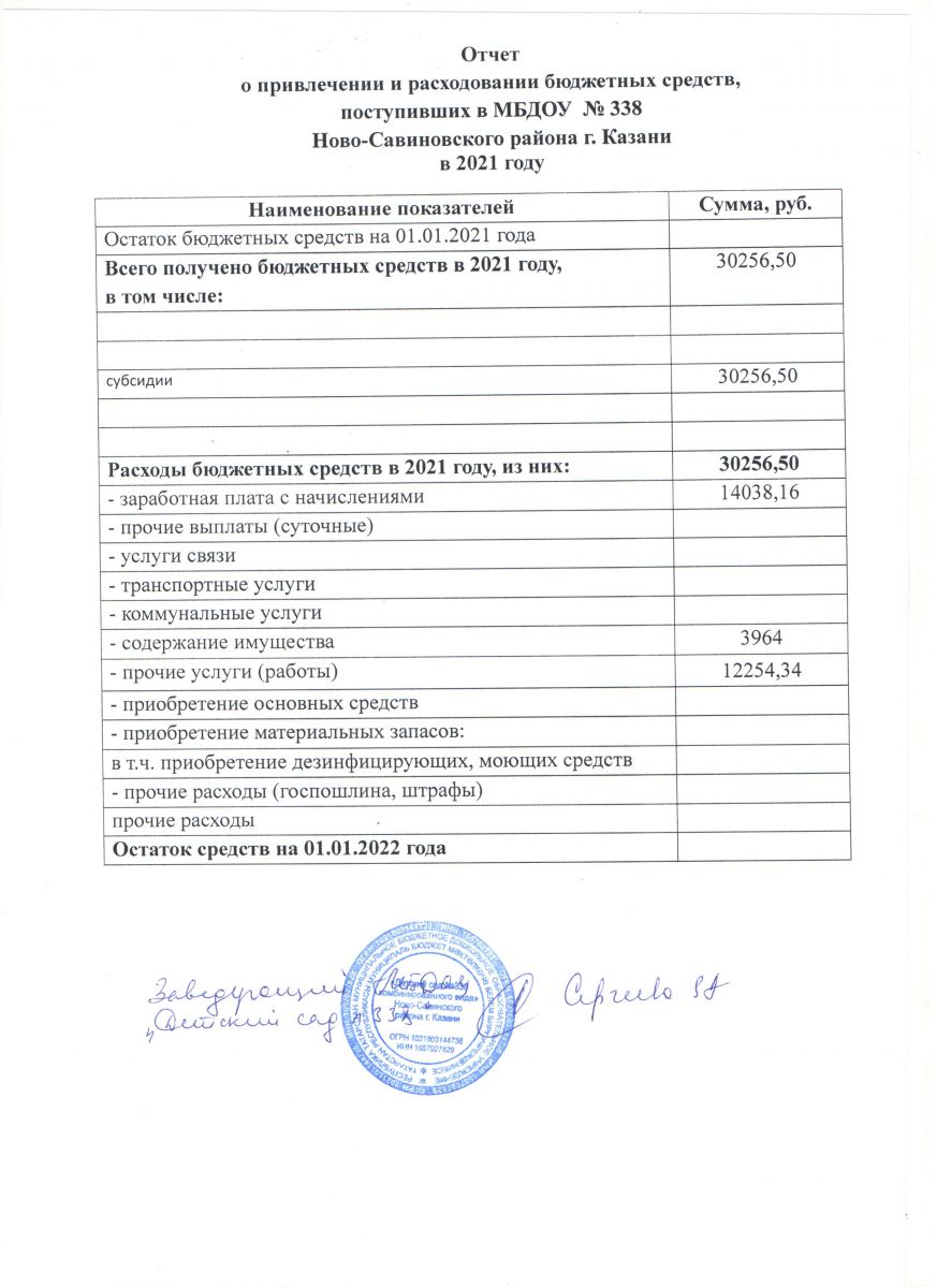Отчет о привлечении и расходованию бюджетных средств, поступивших в МБДОУ № 338 в 2021 годуотчет о поступивших бюджетных средств в 2021 г.