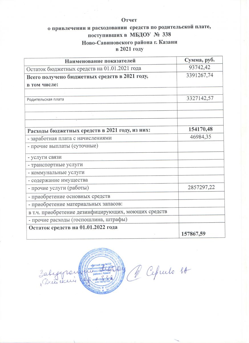 Отчет о привлечении и расходованию средств по родительской плате, поступивших в МБДОУ № 338 в 2021 годуотчет по родительской плате в 2021 году