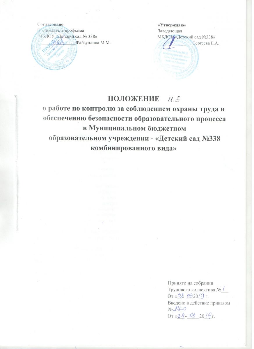 Положение о работе по контролю за соблюдением охраны труда и обеспечению безопасности образовательного процесса в ДОУ положение о работе по контролю за соблюдением охраны труда