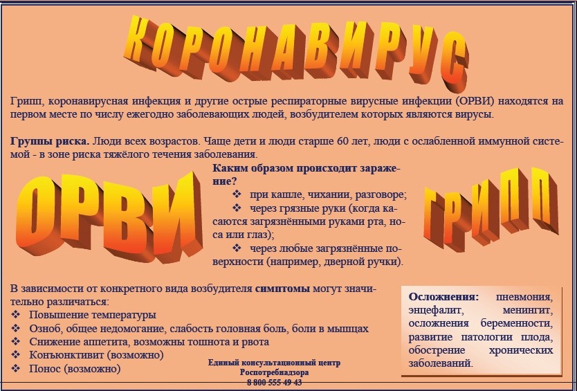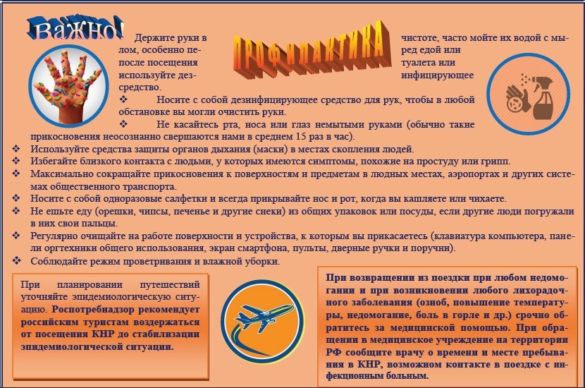 ИНДИВИДУАЛЬНАЯ ПРОФИЛАКТИКА ГРИППА,ОРВИ, В ТОМ ЧИСЛЕ КОРОНАВИРУСНОЙ ИНФЕКЦИИ СОУГО-19 05.03.2020Индивидуальная профилактика гриппа, ОРВИ, в том числе коронавирусной инфекции СОУГО-19ПРАВИЛО 1. МОЕМ РУКИ• Мойте руки с мылом после посещения любых общественных мест, транспорта, прикосновений к дверным ручкам, деньгам, оргтехнике, перед едой и приготовлением пищи.• При отсутствии доступа к воде и мылу необходимо использовать дезинфицирующие средства или одноразовые влажные салфетки.• Не прикасайтесь к лицу и глазам немытыми руками.• Не пользуйтесь общими полотенцами.ПРАВИЛО 2. СОБЛЮДАЕМ ГИГИЕНУ РАБОЧЕГО МЕСТА И ПОМЕЩЕНИЙ• Убедитесь, что Ваше рабочее место гигиенично.• Для удаления вирусов с поверхности столов, стульев, дверных ручек, гаджетов, клавиатуры, мониторов, портфелей, сумок дезинфицируйте их, используя бытовые моющие средства (например, мыльный раствор).• Часто проветривайте помещения на работе и дома, проводите влажную уборку.ПРАВИЛО 3. СОБЛЮДАЕМ ОБЩУЮ ГИГИЕНУ.• Ежедневно принимайте душ, мойте волосы. Отдавайте предпочтение гладким прическам (распущенные волосы, часто контактируя с лицом, увеличивают риск инфицирования).• В течение дня 3-4 раза промывайте проточной водой лицо и носовые проходы.• Ограничьте приветственные рукопожатия, поцелуи и объятия.• На работе принимайте пищу только в специально отведенных местах.ПРАВИЛО 4. ЗАЩИЩАЕМ ОРГАНЫ ДЫХАНИЯ С ПОМОЩЬЮ МЕДИЦИНСКОЙ МАСКИ.• Медицинские маски используются при посещении мест массового скопления людей, поездках в общественном транспорте, при уходе за больными и при общении с лицами с острыми респираторными вирусными инфекциями.• Чтобы обезопасить себя от заражения, важно правильно носить маску:- маска должна тщательно закрепляться, плотно закрывать рот и нос, не оставляя зазоров;- влажную или отсыревшую маску следует сменить на новую;- маски следует менять каждые 2 часа;- при снятии старайтесь не касаться поверхностей маски руками;- использованная маска должна утилизироваться в мусорный контейнер;- не используйте вторично одноразовую маску.• В случае отсутствия одноразовой маски, ее можно сшить несколько в домашних условиях из 4 слоев марли.• При уходе за больным, после окончания контакта, маску следует немедленно снять и тщательно вымыть руки.• Не рекомендуется использование маски на открытом воздухе.• При чихании и кашле использованный тканевый носовой платок необходимо сразу менять, стирать ежедневно и проглаживать с обеих сторон. При возможности желательно использовать бумажные носовые платки.ПРАВИЛО 5. ЧТО ДЕЛАЕМ ПРИ ПОЯВЛЕНИИ ПЕРВЫХ СИМПТОМОВ (высокая температура тела, озноб, головная боль, слабость, заложенность носа, кашель, затрудненное дыхание)• Ограничьте контакты.• Останьтесь дома и обратитесь в лечебное учреждение за медицинской помощью.• Используйте для еды и питья индивидуальную посуду и мойте ее индивидуальной губкой с моющими средствами.ПРАВИЛО 6. ПРИ ВЫЕЗДАХ В КОМАНДИРОВКУ ИЛИ НА ОТДЫХВоздержитесь от поездок в зону риска по распространению вирусной инфекции, в том числе коронавирусной СОУГО-19.В случае выезда информируйте работодателя о стране, которую планируете посетить и сроках.