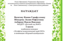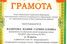 Поздравляем воспитателя по обучению детей татарскому языку Фанию Гарифулловну и воспитанников подготовительной группы за 2 место в районном этапе YI международного литературного конкурса чтецов "Джалиловские чтения". На конкурс было представлено стихотворение М.Джалиля "Ишек тебендә".