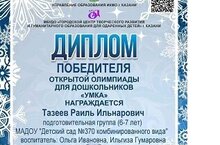 Ежегодно по плану работы Управления образования ИКМО г. Казани проводится открытая олимпиада для дошкольников "УМКА". И в этом году наши выпускники приняли участие и заняли призовые места и стали победителями. Поздравляем! Дальнейших успехов!