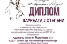 Воспитанница Идрисова Амелия ( восп.Палецкая О.А) приняла участие в республиканском конкурсе « В созвездии А.С. Пушкина и Г. Тукая» . Награждена Дипломом лауреата 2 степени. Поздравляем!