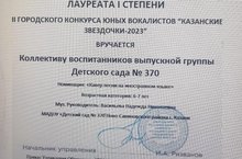 Наши воспитанники приняли участие в городском конкурсе " Казанские звездочки- 2023" и заняли призовое место ( ДК им. Алиша). Поздравляем! Дальнейших успехов!