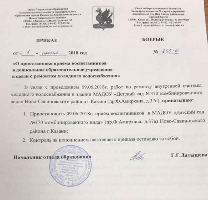В связи с проведением 9,10,11 июня 2018 года работ по ремонту внутренней системы холодного водоснабжения в здании детского сада и на основании приказа (№ 355- О от 01.06.2018) отдела образования Ново- Савиновского района г. Казани 9 июня 2018 года (9 июня- рабочий день, а 10 и 11 июня - нерабочие дни) прием воспитанников в детский сад будет приостановлен. С 13 июня 2018 года детский сад будет работать в обычном режиме. -