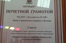 Коллектив детского сада была награждена Почетной грамотой Отдела образования УО ИКМО г.Казани по Авиастроительному и Ново-Савиновскому районам за 2 место в районном этапе городского конкурса "Игровая площадка - территория оздоровления,воспитания, развития".
