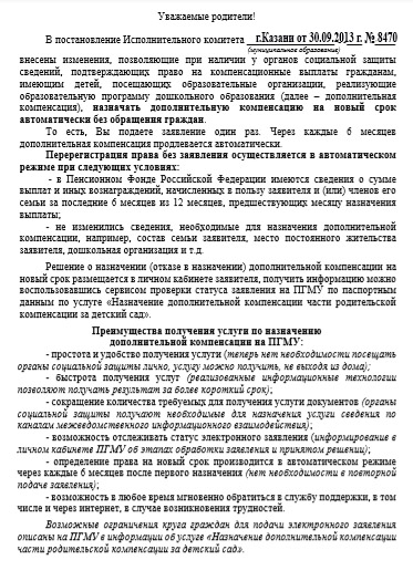 Уважаемые родители! Министерство труда, занятости и социальной защиты Республики Татарстан информирует Вас о том, что в органах социальной защиты реализована возможность получения на очередной срок муниципальной услуги по назначению компенсационных выплат гражданам, имеющим детей, посещающих образовательные организации, реализующие образовательную программу дошкольного образования (дополнительная компенсация), путем автоматического назначения без повторного обращения заявителя в органы социальной защиты. С подробной информацией можете ознакомиться в группе, которую посещает ваш ребенок и по следующей ссылке: