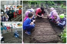 В огороде детского сада дети вместе с воспитателями приучаются к элемнтарному посильному труду - высажывают овощи и ягоды, которые выбрали сами дети на посадку. У каждой группы своя грядка.