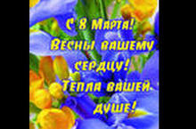Пусть всегда женский день не кончается, Пусть поют в Вашу честь ручейки, Пусть солнышко Вам улыбается, А мужчины Вам дарят цветы. С первой капелью, с последней метелью, С праздником ранней весны Вас поздравляем, сердечно желаем Радости, счастья, здоровья, любви!С праздником Вас 8 Марта! 07.03.2012