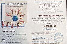 17.11.2022 г. наш воспитатель Сафина Р.И. приняла участие в III Международном фестивале Татарских культурных центров,проводимый в рамках Российского года народного искусства и сохранения культурного наследия,организованном на базе Казанского кооперативного института.За творческое участие и представление своего мастерства Резеда Ильдусовна была награждена Дипломом 1 степени.Поздравляем!