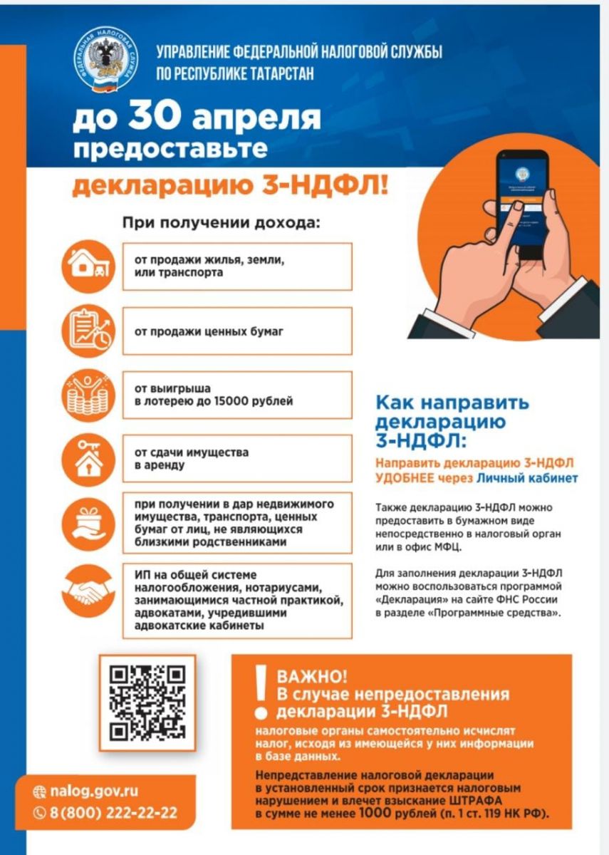 Информация УФНС России по Республике Татарстан в целях информирования широкого круга лиц направляет информационную листовку «До 30 апреля предоставьте декларацию 3-НДФЛ»