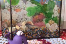 В природном уголке младшей группы № 13 есть РЫБКИН ДОМ. Родители принесли аквариум, даже привезли ракушки с моря. Ребята сами заполняли его цветными камешками, ракушками, искусственной растительностью и водой. Всем очень нравится наблюдать за рыбками и морским коньком.