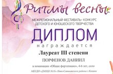 Поздравляем Даниила (младшая группа № 1) с победой в Межрегиональном фестивале-конкурсе детского и юношеского творчества «Ритмы Весны»!!! Желаем Даниилу и его маме Лейле Завдатовне дальнейших творческих успехов и побед!!!