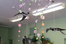Вот как ярко и задорно дети подготовительной к школе группы №9 приготовились встречать весну. Теперь в группе расцвели цветы и прилетели веселые ласточки, которые сделали дети совместно с воспитателями.