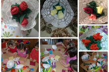 В старшей группе №5 дети совместно с воспитателем Людмилой Витальевной, изготовили своими руками подарки для любимых мам. Посмотрите, какие красивые букеты у нас получились.