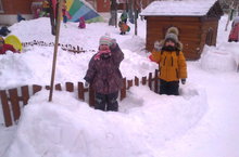 Благодаря вашим отзывчивым сердцам и умелым рукам на участке появилась горка с бортиками и ступеньками, положено начало снежному лабиринту, наметились дорожки-тропинки и снежные холмики-основы для сказочных существ…Госпожа Метелица распуши свою перину - дай нам снега половину!
