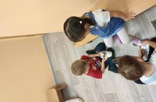 Наши мальчики из младшей группы №1 помогают девочке одеть сандалики.