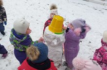 Ребята второй младшей группы 2, радуясь первому снегу, дружно слепили чудесного снеговика.