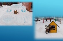 На прогулочном участке младшей группы № 3 появились избушки. Избушки не простые… одна- ледяная, в которой живёт Лисичка. А рядом с ней по соседству в лубяной избушке живёт Зайчик.