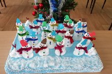 Ребята подготовительной группы № 2 вместе с воспитателями выполнили коллективную работу "Снеговики спешат на Новый год".