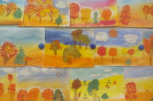 Ребята подготовительной к школе группы № 11 рисовали осенние картины. На занятиях они получили представления о пейзаже, вспомнили о признаках осени, научились смешивать краски, рисовать листву методом "тычка", передавать первый и второй планы, находить линию горизонта.
