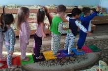 В средней группе № 7 появилась ортопедическая дорожка, по ней ребята каждый день ходят босиком перед сном и после сна. Применение массажного коврика для профилактики плоскостопия даже лучше природных помощников, дорожка обеспечивает глубокий терапевтический эффект и незабываемое удовольствие малышам.