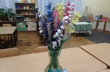Вечернее время в детском саду... Как много можно сделать вместе с детьми, многому научиться. Ребята старшей группы №10 вместе с воспитателями решили сделать цветы своими руками для украшения группы. Гиацинты получились очень красивые, если поместить такой букет в вазу, он будет радовать нас ещё долгое время.