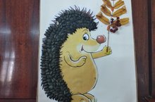 Вика вместе с папой принесла поделку в свою группу № 1 и сказала, что этот Ёжик будет жить с нами. Мы ему выделили место. И теперь ёжик поднимает настроение всем, кто приходит. И вы посмотрите на нашего Ёжика и улыбнитесь ему)))