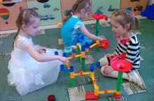 В игровом развивающем комплексе дети старшей группы № 15 ищут различные способы для доставки шарика в нужное место по лабиринту.