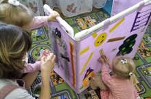Педагогами первой младшей группы №2 довольно много внимания уделяется развитию моторики рук. Для ее развития используются разные виды деятельности, которые способствуют развитию моторики – это пальчиковые игры, элементы самомассажа, дидактические пособия. Особенно интересно малышам играть с пособиями «бизиборда», в котором есть шнуровка, бельевые прищепки, тесемочки, шнурки, нитки, бусы, молнии, пуговицы.