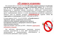 На основании ФЗ от 23.02.2013 N 15-ФЗ «Об охране здоровья граждан от воздействия окружающего табачного дыма и последствий потребления табака», ФЗ от 29.12.2012 года № 273-ФЗ «Об образовании в РФ» ст.41 п.7. Охрана здоровья обучающихся. Профилактика и запрещение курения, употребление алкогольных, слабоалкогольных напитков, наркотических средств и психотропных веществ, их прекурсоров и аналогов и других одурманивающих веществ и в целях предотвращения воздействия окружающего табачного дыма на здоровье человека, ЗАПРЕЩАЕТСЯ курение табака на территории и в помещениях МАДОУ «Детский сад №70».