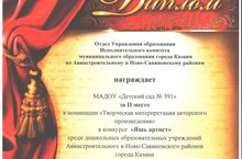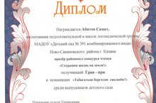 Поздравляем лауреата городского фестиваля детского творчества Абитова Самата и весь коллектив детского сада с новыми достижениями и желаем дальнейших успехов в работе!