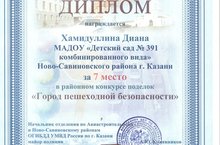 Воспитанница 3 группы Хамидуллина Диана приняла участие в районном конкурсе поделок «Город пешеходной безопасности» по профилактике ДДТТ среди воспитанников дошкольных образовательных организаций, где ее работа была отобрана на городской этап. По итогам городского этапа конкурса Диана получила диплом за 7 место. Поздравляем! Желаем дальнейших творческих побед!