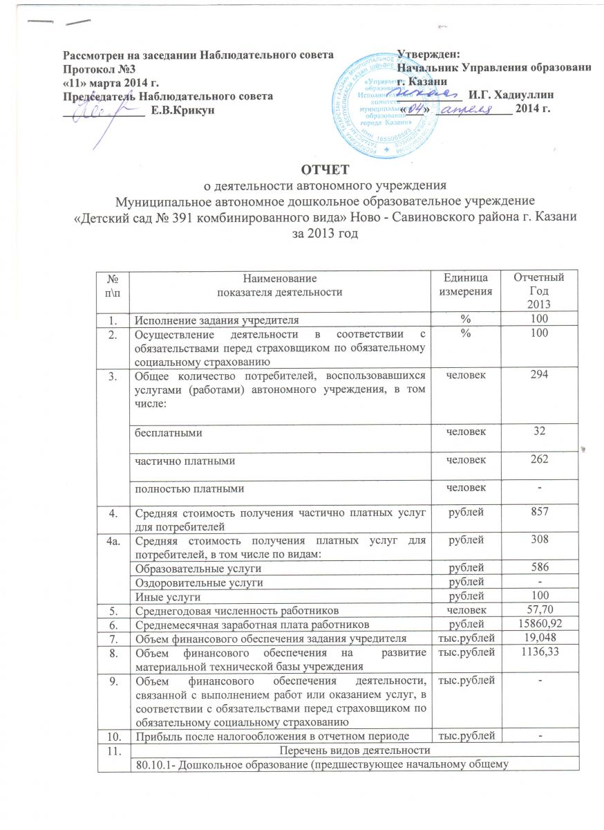 отчет о деятельности автономного учреждения МАДОУ "Детский сад № 391 комбинированного вида" за 2013 год