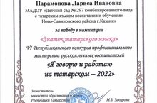 Мы поздравляем нашего педагога Парамонову Ларису Ивановну, ставшей победителем республиканского конкурса "Я говорю и паботаю на татарском-2022" в номинации "Знаток татарского языка".