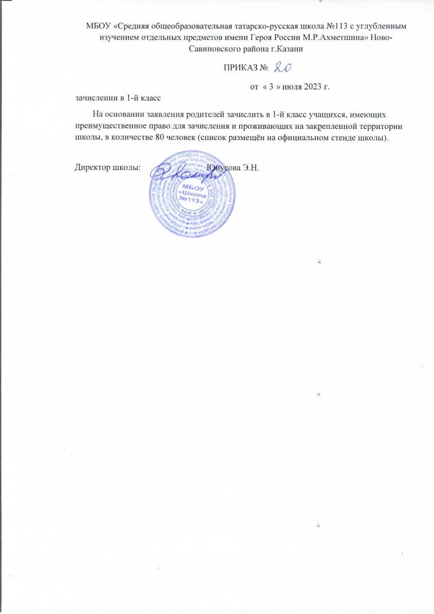 Приказ о зачислении в первый класс от 3.07.2023