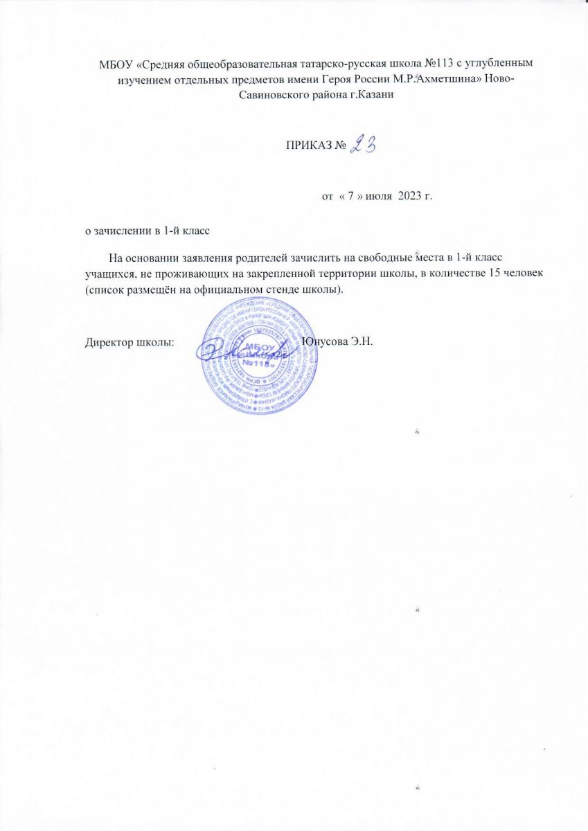 Приказ о зачислении в первый класс от 7.07.2023
