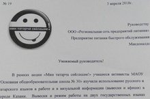 Безнең мәктәп укучылары "Мин татарча сөйләшәм" акциясе кысаларында яшелчә сату кибете "Майский", ООО СПП "Макдоналдс" рестораннарын татар телен актив кулланырга чакырып хат юлладылар.