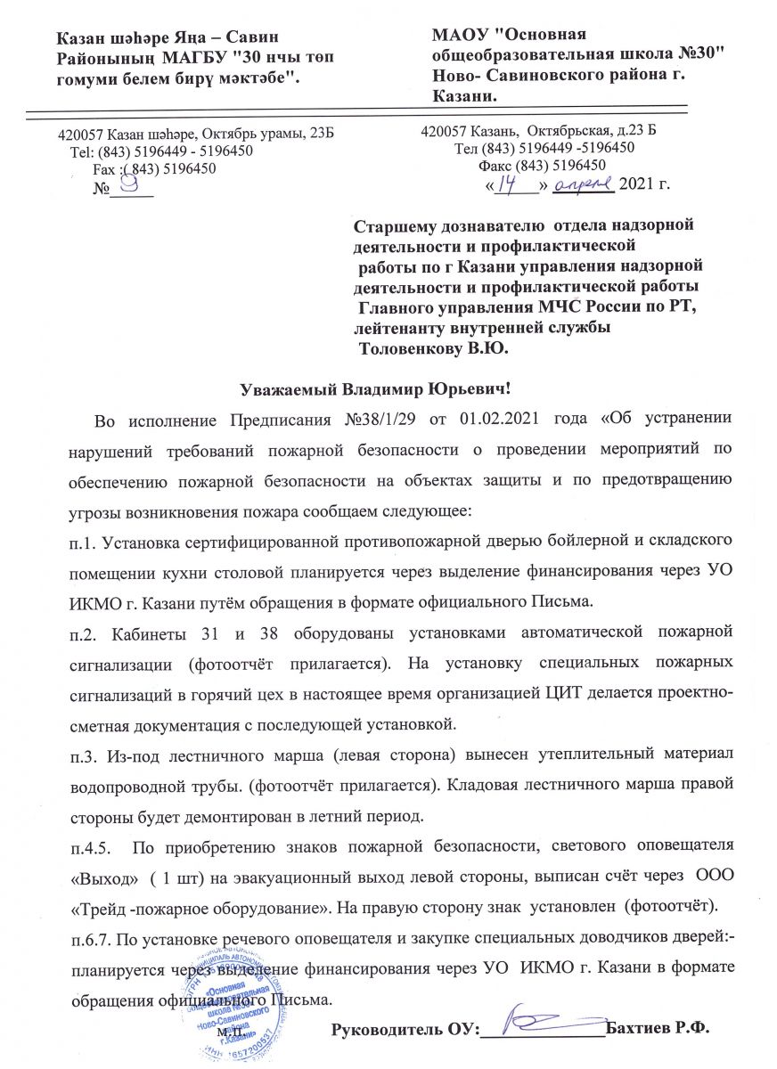 Ответ на предписание №38/1/29 от 19 марта 2021 года "Об устранении нарушений требований пожарной безопасности в МАОУ "ООШ №30"