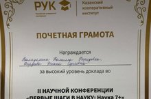 Поздравляем с почетной грамотой Валиуллину Камиллу 9А, Фардееву Диану 10А (науч.рук. Бурганова Т.Н.), участников II Республиканской научной конференции «Первые шаги в науку», прошедшей на базе Казанского кооперативного института