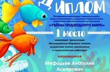 Республиканский конкурс творческих работ «Тайны подводного мира»: Шарафиев Инсаф 2Б класс - 2 место; Мефодьев А.А., учитель начальных классов - 1 места в двух номинациях! Поздравляем!