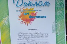Шайхутдинова Карина (руководитель Шайхутдинова А.А.) получила диплом в номинации «Объёмная и рельефная лепка» на республиканском научно-практическом семинаре «Инновации и традиции:творения и практика»